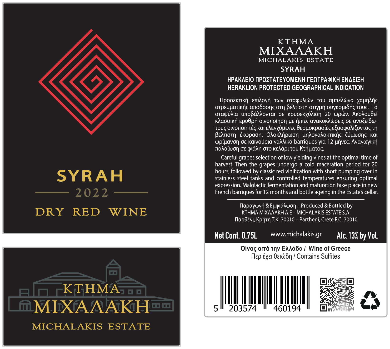 Εσοδεία: 2022 Περιοχή: Παρθένι, Ηρακλείου Κρήτης Αμπελώνας: Ορεινοί Αμπελώνες του Κτήματος σε υψόμετρο 450-480 μέτρων. Τρύγος Χειρωνακτικός: Τέλη Αυγούστου Αλκοολικός Τίτλος: 13% by Vol Οινοποίηση: Προσεκτική επιλογή των σταφυλιών του αμπελώνα χαμηλής στρεμματικής απόδοσης στη βέλτιστη στιγμή συγκομιδής τους. Τα σταφύλια υποβάλλονται σε κρυοεκχύλιση 20 ωρών. Ακολουθεί κλασσική ερυθρή οινοποίηση με ήπιες ανακυκλώσεις σε ανοξείδωτους οινοποιητές και ελεγχόμενες θερμοκρασίες εξασφαλίζοντας τη βέλτιστη έκφραση. Ολοκλήρωση μηλογαλακτικής ζύμωσης και ωρίμανση σε καινούρια γαλλικά barriques για 12 μήνες. Αναγωγική παλαίωση σε φιάλη στο κελάρι του Κτήματος. Σερβίρεται μεταξύ: 16-18°C