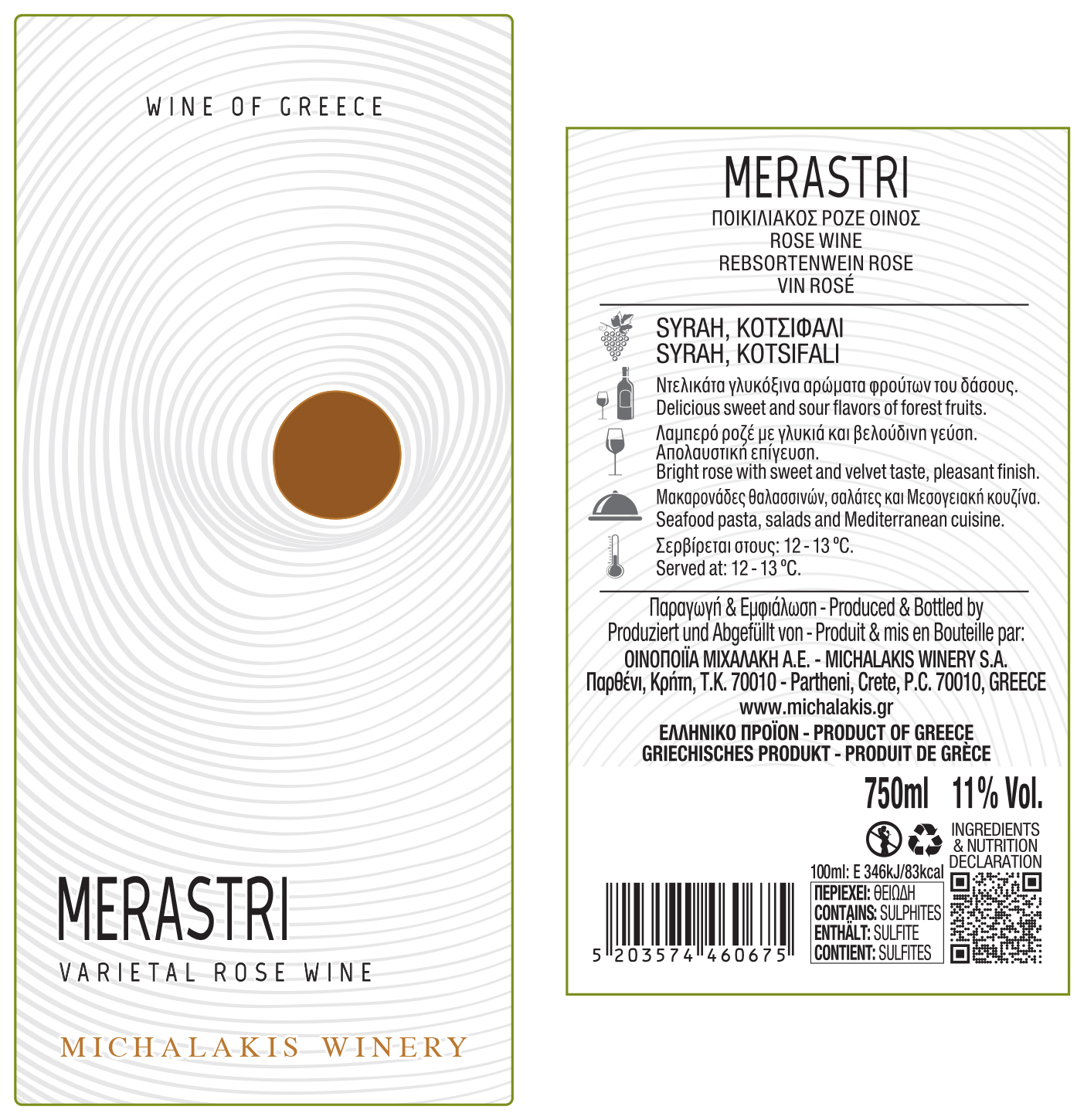 Ποικιλιακή Σύνθεση: Syrah, Μανδηλάρι Στυλ: Ροζέ Τρύγος Χειρωνακτικός: Τέλη Αυγούστου έως μέσα Σεπτεμβρίου. Αλκοολικός Τίτλος: 11% by Vol. Οινοποίηση: Ξεχωριστή οινοποίηση για την κάθε ποικιλία. Κλασική ροζέ οινοποίηση με έλεγχο