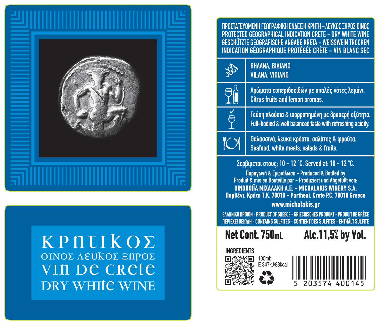 Ποικιλιακή Σύνθεση: Βηλάνα & Βιδιανό Στυλ: Λευκός ξηρός Γεωγραφική Ένδειξη: Προστατευόμενη Γεωγραφική Ένδειξη, Κρήτη Τρύγος Χειρονακτικός: Τέλη Αυγούστου Αλκοολικός Τίτλος: 11,5% by Vol. Οινοποίηση: Σύγχρονη τεχνολογικά κλασική λευκή οινοποίηση για την κάθε ποικιλία ξεχωριστά που
